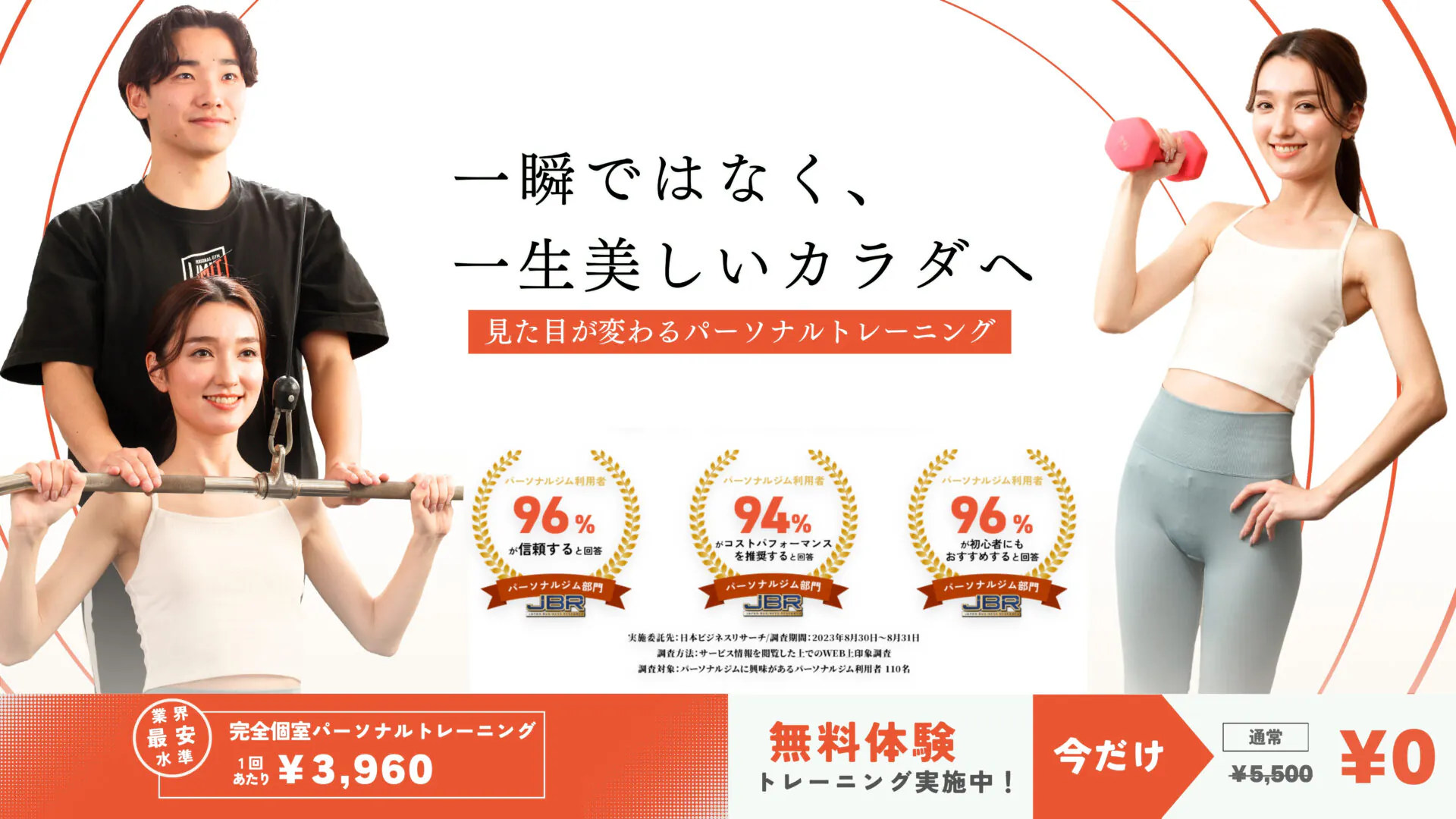 圧倒的な実績を持つだけでなく、ハイレベルな知識と経験が必要となる採用率3.6%の入社試験を勝ち抜き、採用されています。ただ痩せるだけではなく、あなたの考える「こんなカラダになりたい」という想いに寄り添い、体を変えるためのサポートをさせていただきます。運動が初めての方でも安心してお任せください。